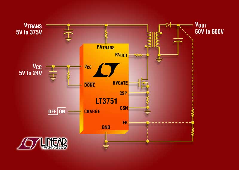 凌力尔特" title="凌力尔特">凌力尔特公司 (Linear Technology Corporation) 推出反激式控制器 LT3751,该器件可将大型电容器迅速充电至高达 1000V。LT3751 驱动一个外部 N 沟道 MOSFET,可在不到 1 秒钟的时间内将一个 1000uF 电容器充电至 500V,从而使该器件非常适合于诸如专业照相闪光灯系统、RF 保安、库存控制系统和专门的高压电源等应用。LT3751 无需光耦合器就可配置用于主端输出电压检测。就更低噪声" title="低噪声">低噪声和更严格调节的应用而言,输出电压端的一个电阻分压器网络可用来调节输出,从而使该器件非常适合于满足高压电源需求。