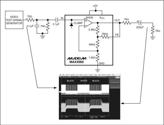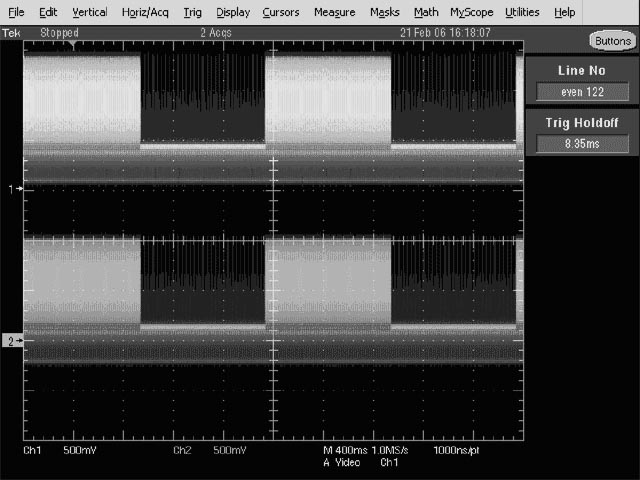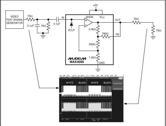 并联在对地75Ω输入端接电阻两端的0.1μF电容用来滤除视频波形中的高频成份,消除视频测试信号中黑色部分的混叠现象。与行周期(~64μs)相比,示波器迹线的时标(400ms)要长的多。如果没有0.1μF的电容,那么视频测试信号中的黑色部分将出现混叠,使输入信号的黑色部分和白色部分很难区分。输出信号的黑色部分加入混叠信号后,就如同白色信号一样。