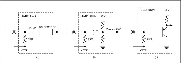 电视设计中存在的主要问题是,在输入级设计上从来没有一个被普遍采纳的解决方案。历史上,大量电视机都采用不同的输入级,无论信号来自交流或直流耦合信号源,都可能使某些电视机出现问题。有这么多种不同类型的接收设备,要实现普遍兼容性是不可能的。基于成本考虑,占信号发送设备绝大多数的低端视频信号源都采用直流耦合输出。