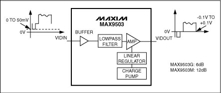 MAX9503对标清视频信号进行滤波和放大。MAX9503的输入可直接与视频数模转换器(DAC)的输出相连。内部重建滤波器可平滑阶跃和减小DAC视频信号上的毛刺。MAX9503可将视频信号平移至较低电压,从而使输出端的消隐电平逼近地电平。DirectDrive需要一个集成的电荷泵和线性稳压器产生一个干净的负电源电压,从而将同步脉冲驱动至地电平以下。电荷泵在视频输出端注入的噪声极小,画面看起来毫无瑕疵。