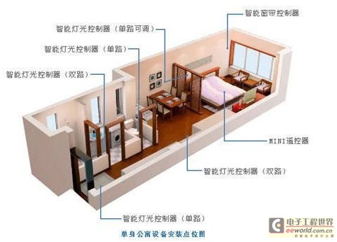 当你身处在外面,一个短信就可以让家中自动煮饭,或者自动打开空调以及热水器;而身处智能家居环境中,当你回到家里,随着门锁被开启,家中的安防系统自动解除室内警戒,廊灯缓缓点亮,空调、新风系统自动启动,你最喜欢的背景交响乐轻轻奏起。在家中,只需一个遥控器就能控制家中所有的电器。每天晚上,所有的窗帘都会定时自动关闭,入睡前,床头边的面板上,你触动“晚安”模式,就可以控制室内所有需要关闭的灯光和电器设备,同时安防系统自动开启处于警戒状态。