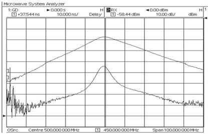 图3显示了用MSA测量2.2GHz至500MHz下变频器的幅度和时延响应的屏幕快照,这时的MSA是用直通连接方法校准的。在某些情况下,上述直通连接校准可能无法提供足够的精度。取代方法是使用具有已知或设定时延性能的“黄金标准”设备校准仪器。合适的黄金标准设备可以是带外部本振的匹配良好的宽带混频器。另外一个选项是使用改进的DUT,其群时延关键元件(通常是滤波器)需要被旁路掉。