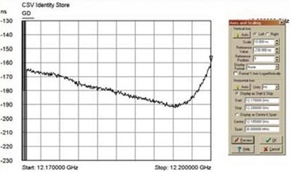 图5显示了通过单个地面站对地球同步轨道卫星的群时延特性测量结果。输入(上行链路)频率是14.47GHz至14.5GHz,输出(下行链路)频率是12.17GHz至12.2GHz。校准在输入频率处完成——通常在源频率而不是接收机频率处完成校准,目的是通过频带切换和频率调制硬件消除仪器内部的时延变化。