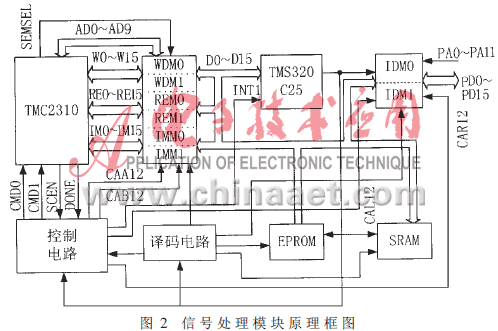 由于TMC2310是可编程的专用DSP器件,我们用一片TMS320C25 DSP器件与之配合,采用主从结构、并行处理方式,加上外围共享存储器阵列对等组成处理模块。TMS320C25除对TMC2310进行编程及控制外,还以并行运算处理的方式完成一些后续处理及辅助运算(如数据抽取、积分等)。整个电路系统采用模块化设计,便于调试及扩展。信号处理模块原理框图如图2所示。