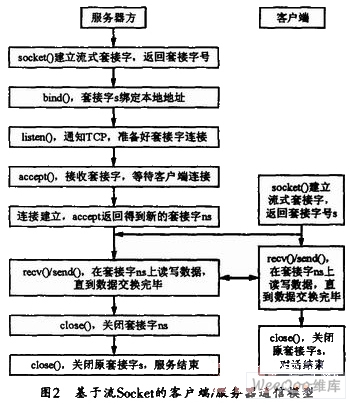 网络通信的基石是套接字,一个套接字是通信的一端,在这一端上可以找到与其对应的一个名字。一个正在被使用的套接字都有它的类型和其相关的任务,VxWorks可以实现与BSD4.4TCP/IP兼容的Socket编程接口。由于面向连接的服务器使用的传输层协议可保证数据传送的可靠性和顺序性,因此,本文的系统端采用基于流Socket的客户机/服务器(Client/Server)编程模式,其程序可以分为客户端程序和服务端程序。其通信模型如图2所示。
