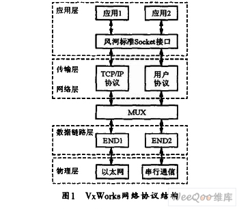 VxWorks通常使用以太网作为最底层传输媒介。而在传输媒介的上一层,VxWorks则用TCP/IP协议来用于VxWorks进程与其它主机环境进程之间的传输数据。用户程序需要的就是在TCP/IP层之上进行通信。因此,利用VxWorks对多任务和socket的良好支持,可以方便的实现网络通信。