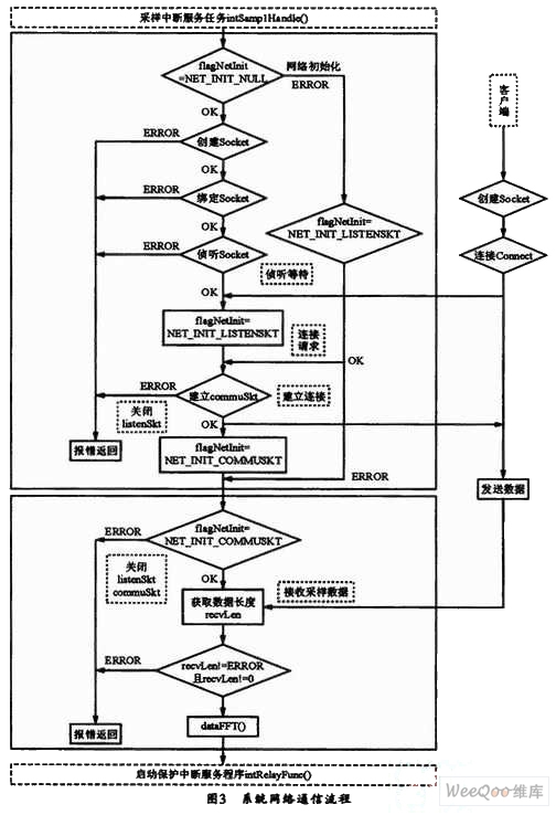 本设计采用嵌入式计算机结合数据采集板的方式,并由VxWorks实时操作系统为嵌入式计算机提供底层软件平台的支持。嵌入式计算机连接数据采集板,并控制数据的采集过程,以(以牵引供电系统馈线保护为例)在工频周期下,从TV、TA侧采集共2路电压、电流信号,每周波采样24个数据点,采样周期为833μs。在该保护系统中,嵌入式系统端为客户端,并采用VxWorks基于Socket客户机编程模式,主要负责发布命令,监控命令的执行状况,其主要工作是数据的采集和存储;服务器端为微机保护运行所在的PC机,负责执行命令并返回命令执行的结果,主要工作是为采集数据的微机提供算法处理保护以及保护启动判断。本系统只需要在服务器启动后,就可以进入等待状态,所有其他的动作都可以等待和客户端建立连接后,由人机界面来控制。其系统网络通信流程如图3所示。