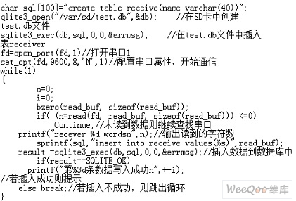 下位机嵌入式Linux终端的程序设计为:先创建一个数据库文件test.db,接着就是一个死循环,串口不停地查找有没有数据写入,当检测到数据时,便写入到test.db中,若写入有误,则立即跳出循环,终止程序。