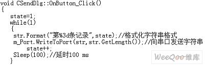为了验证sqlite3数据库在嵌入式Linux[3-4]终端下的执行效率和稳定性,为此做了一个简单的测试实验:通过上位机程序向嵌入式Linux终端的串口定时发送字符串;嵌入式Linux终端接收到字符串便立即写入到下位机的数据库中。自后查看数据中的数据,看看有没有遗漏和误码。上位机的程序使用VC6.0开发,整个程序界面只设了一个按键,按下按键,上位机就向嵌入式Linux终端不停地发送字符串数据,按键响应程序设计如下: