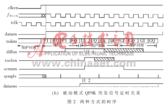 比特同步模块的作用就是锁定输入数据并使其与比特时钟同步。同步有两种方式:外部数据被Stel-1109内部比特时钟的下降沿锁定,称为主动方式;外部数据由外部时钟上升沿锁定,称为被动方式。当为主动方式时,fBitclk受clken控制,当clken为低电平时,fBitclk没有输出。图2给出两种方式的时序。