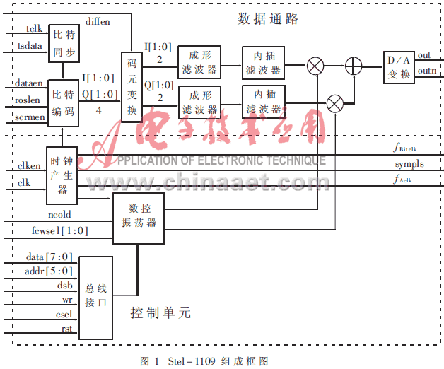 图1给出Stel-1109的内部结构,主要由数据通路和控制单元组成。数据通路由比特编码、码元变换、两个数据滤波通道(I、Q)组成。每个通道都包含有Nyquist滤波器、内插滤波器和调制器。控制单元由总线接口单元(BIU)、时钟产生器和数控振荡器(NCO)组成。