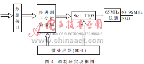 图4示出了多进制正交扩频编码和QPSK调制实现的原理框图。微处理器8031完成对系统的初始化,包括对Stel-1109芯片工作参数的配置和FPGA初始参数的装载。同时微处理器还实现发送时序的产生以及系统的控制。多进制正交扩频编码是由FPGA和EPROM实现的。