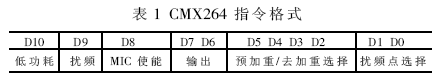 CMX264提供串行接口来控制内部状态和工作模式,指令的功能包括:省电模式、是否扰频、话音输入输出控制、预加重/去加重选择和扰频点选择。指令的格式定义如表1所示。