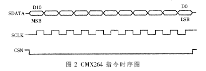 数据通过DATA端按高位在前的顺序写入,在SCLK端的上升沿锁存数据,CSN端提供片选信号。CMX264处在从接收的位置,单片机只需根据时序定义,通过I/O口即可实现此串行接口的功能,对CMX264进行控制。时序如图2所示。