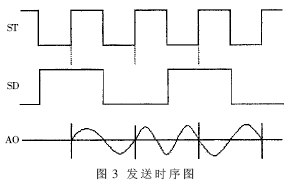 发送数据时,单片机输出的数据SD在ST上升沿被锁存,因此将ST与单片机的外部中断INT0相连,INT0设置为下降沿触发,单片机在中断处理程序中改变SD电平,数字信号经过内部调制后产生MSK信号输出AO,发送时序如图3所示。
