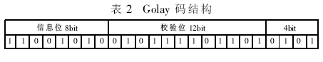 本方案选用的Golay(24,12)码最小距离为8,能纠正3个随机错误同时检测4个错误。针对8位单片机的特点,将信息位缩短为8bit,并在最后添加0101进行帧同步码的提取,最终构成3个字节的完整结构,提高了单片机编码的效率。编解码的程序全部用C语言实现,程序复杂度适中,Atmega8单片机的运算能力完全可以胜任。Golay码结构如表2所示。