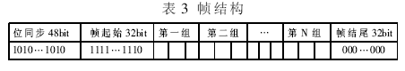 MSM6882接收的数据是与时钟同步的比特流,为了从所接收的数据中提取时钟信号,首先发送6字节即48bit“1”和“0”交替出现的位同步码。为了按字节接收数据,确定每一帧的起始位,需要在比特流中添加帧同步信息,以避免帧同步图案与数据中内容相同而导致的误判。根据所选用的纠错编码特点,每组Golay码三个字节的最后4个bit为0101,即不会出现三个字节以上的连续0或者连续1,所以帧起始码选用31bit1和1bit0,帧结束码采用32bit连0。在接收中断处理程序中,检测到31bit1和1bit0就开始按字节接收数据,此后每3个字节一组进行纠错解码,同时开始对接收到的连续0进行计数,超过32个就认为一帧接收完毕。帧结构如表3所示。