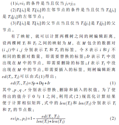 基于DOM模型的Web信息抽取技术的基础算法就是比较两棵HTML标签树的相似性。比较两棵树相似性的方法之一就是计算它们的编辑距离,要计算两棵树之间的树编辑距离[3],通常的做法是找到两棵树之间权值最小的一个映射(mapping),映射的定义如下: