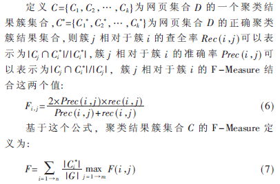 对于聚类结果精确度的评估标准,采用聚类算法通用的F-Measure评估,它结合了信息抽取中的准确率(Precision)和查全率(Recall)的思想: