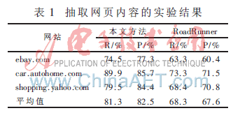 从三个网站的信息抽取结果可知,本文基于网页聚类的方法能取得较好的准确率和查全率,平均值分别达到80.3%和81.5%。比较RoadRunner的抽取结果,平均67.3%和66.6%的准确率和查全率,本文提出的方法明显能达到较好的抽取结果,因为RoadRunner没有考虑网页文本节点模板,而且对一个页面出现多个数据集的情况不能提取网页的主要内容。分析本文方法对个别网站抽取结果不太理想,是因为网站产品信息列表分布不均匀,主要信息块比较分散,造成准确率和查全率比较低。对于其他大部分主要信息块比较集中的数据提供网站,该方法抽取准确率和查全率在75%~85%,个别高度模板化的网站甚至可以达到90%,网页内容抽取实验结果如表1所示。
