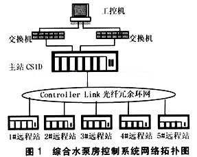 本文以某电厂水系统中的综合水泵房控制系统为例介绍一种通信冗余的PLC系统。综合水泵房系统主要监控综合水泵房和深井泵房设备的工作状态。综合水泵房控制对象包括循环水泵、冷却塔风机、生活水泵、消防水泵、消防稳压水泵、相关电动阀门等。深井泵房距离综合水泵房较远,而且设备分散布置。其控制对象包括深井泵、出口电动阀门等。基于系统通信的可靠性和设备物理位置要求,本系统采用了OMRON公司最新推出的CS1D Duplex System和 CLK(Controller Link)光纤冗余环网作为综合水泵房系统的控制主体。