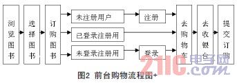 网上购物系统分为前台和后台管理系统,前台管理包括浏览商品﹑查询商品﹑购物车﹑用户信息维等功能。后台管理包括公告管理﹑商品管理﹑订单管理﹑投诉管理和用户管理等模块。购物功能是电子商务购物网站与其他一般网站最重要的区别,一个好的购物功能设计也是体现一个系统是否完善的重要表现。购物功能的工作主旨就是让客户便于浏览,使用方便。浏览完图书,看到合适的后,我们用户第一件事情就是下订单来购买图书,我们可以在页面中设置一些按钮和购物车功能来实现这个操作。购物流程图,如图2: