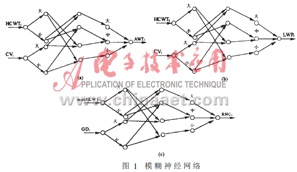 根据前面的模糊规则表,可把这些模糊规则映射到模糊神经网络(FNN)中,从而提高推理的智能性。该网络提供了解释和推理的可理解的模型结构,通过它可以以一种清晰的方式描述知识,模糊规则可用网络的节点对象、连接权对象、连接结构等来翻译解释;同时具有知识获取和学习能力。与上述规则表相对应的模糊神经网络分别如图1(a)、(b)、(c)所示。