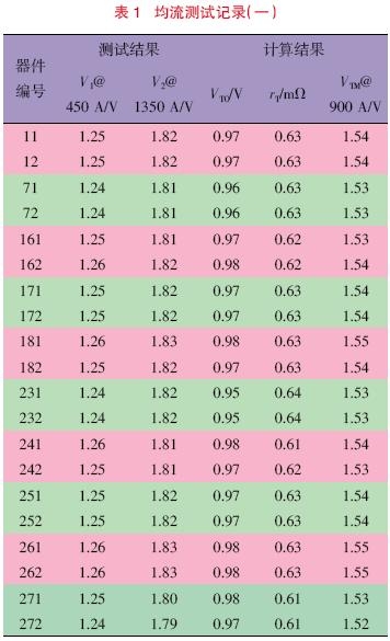 2)两个表中的数据都是近期在联均流测试中获得的数据,看上去有些理想化,不够典型,但作为并联均流测试筛选匹配器件的方法是很清晰的。通常认为并联均流的器件必须选同一批次的,因而测试筛选匹配工作容易得多,即免去了开通时间一致的匹配筛选。器件并联均流中的测试(或计算)电流的选取必须由用户的实际电流而定,这是特别要注意的前提条件。
