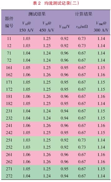 (2)将注重点放在通态平均电流IT AV和通态平均压降VT上,按文献[1]提供的均流系数的方法进行匹配筛选,虽然通过了用户的应用要求,但总还不够理想,这是因为通态平均压降VT 反映的是稳定后的平均效果,这样变化因素更多更难控制,不如采用瞬时值优越;