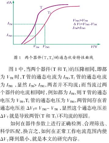 不言而喻,之所以有不均流现象,是由于器件的不同通态参数引起的,只有把握好关键的器件通态参数这一关,才是抓住了并联均流的主要矛盾。这一现象如图1所示。