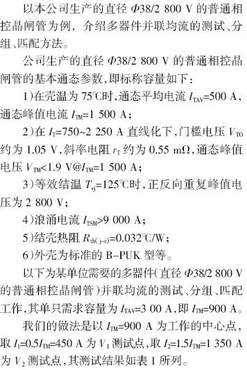 6)实践反复证明,依据用户的要求,采用V1、V2值的测试(或计算)确定通态门槛电压、通态斜率电阻值,进而匹配均流器件是一个方便简捷实用的好办法。按照这样的均流匹配方法,在一定条件下,省掉电抗器,实现了晶闸管的直接并联。