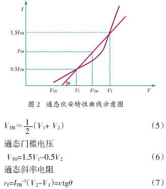 多数电力半导体器件的通态伏安特性曲线都可用发展了的赫莱特(Herlet)关系式[8]来表征,即瞬时通态电压VTM表示通态结压降、通态体压降、以及接触压降之和。对于一个制作精良的器件,一般可以忽略接触压降(接触压降是符合欧姆定律的,即使制作水平差,也很容易将它筛选出去),由通态结压降Vj、通态体压降Vm公式