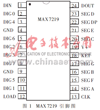 MAX7219是一种新型的串行接口的8位数字静态显示芯片。它是由MAXIM公司新推出的24脚双列直插式芯片,其引脚图如图1所示。