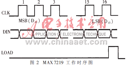 图2为MAX7219工作时序图。由图2可知,DIN是串行数据输入端,在CLK的上升沿,一位数据被加载到内部16位移位寄存器中,CLK端最高输入频率可达10MHz,在输入时钟信号的每个上升沿,均有1位数据由DIN移入到内部寄存器中,LOAD用来装载数据,在LOAD的上升沿,16位串行输入数据被锁存到数字或控制寄存器中。LOAD必须在第16个时钟上升沿的同时或之后、在下一个时钟上升沿之前变高,否则数据将会丢失。