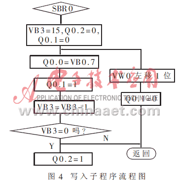 由于MAX7219的控制寄存器和显示寄存器均独立编址,显示程序实际上就是S7-214在Q0.1(CLK),Q0.2(LOAD)时序的配合下不断通过Q0.0(DIN)向MAX7219的相应控制寄存器和数据显示寄存器写入16位二进制数据包的过程。所以问题的关键在于编写一个通用的写入子程序,将VW0的内容从高位到低位在Q0.1(CLK)的作用下依次移入移位寄存器,最后由Q0.2的上升沿(LOAD信号)锁存到相应的内部控制寄存器和数据显示寄存器中去。写入子程序的程序流程图如图4所示。