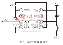 保护电路中延时控制由555定时器构成,555定时器内部包含了两个比较器和一个基本RS触发器,输出带有缓冲器,完全满足开机延时保护控制的要求。定时器的TR(2脚)接地,TH(6脚)由RC充电回路控制。开机瞬间电容C1短路,TH高电平使得输出OUT(3脚)为低电平,随着C1的充电使TH电平逐步下降,当降至2/3VCC时(延时约3~5s)内部触发器翻转,使得输出由低电平变为高电平,触发可控硅导通,将20Ω限流电阻短路,电源进入正常工作状态。延时电路原理图如图3所示。