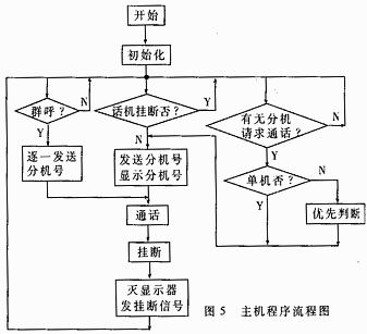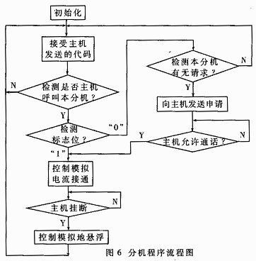 在分机需要与主机通话时,按一下通话按键(分机仅此一按键),单片微机发出数字信号,经单总线送到主机的单片微机。主机单片微机接到信号后,显示分机号码,判断话机是否挂断,若为挂断状态,则循环判断直至话机挂起,拿起话筒后,主机立即向相应的分机发出允许通话的信号,分机接通模拟通道便可进行通话,通话完毕,话筒挂断,主机向分机发送挂断信号,分机将模拟通道的地悬浮。这样,既节约了电能又不影响佞机部分人员的正常工作。