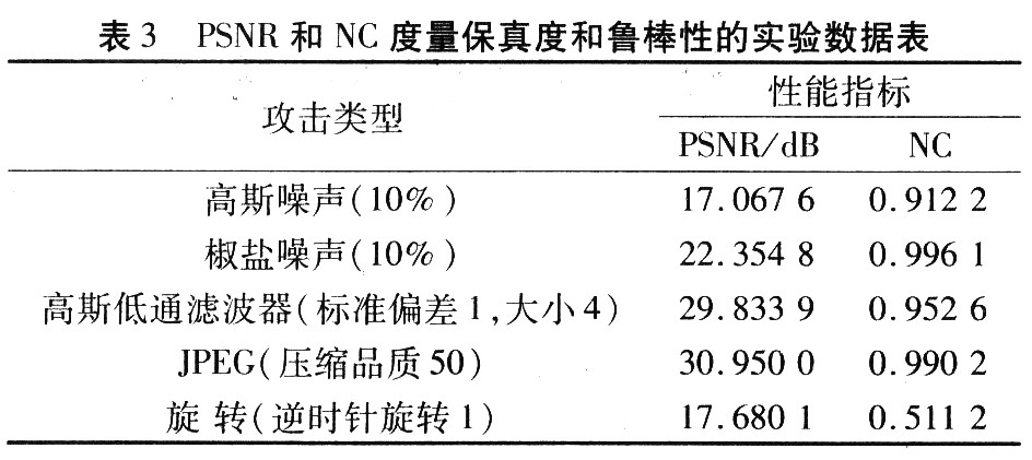 为了测量该算法的不可见性和鲁棒性,对水印图像进行一些常见的攻击实验。包括高斯噪声、椒盐噪声、高斯低通滤波器、JPEG压缩、旋转等攻击。实验结果见表3。在嵌入水印后的图像受到10%高斯噪声、10%椒盐噪声攻击的情况下,NC的值仍然在0.9以上。当水印图像受到50%JPEG压缩攻击时,NC值接近1。从表中还能观察到该算法抗高斯低通滤波攻击的能力较强,但抗旋转攻击能力较差,这是因为原始图像和水印图像的空间关系被打乱。