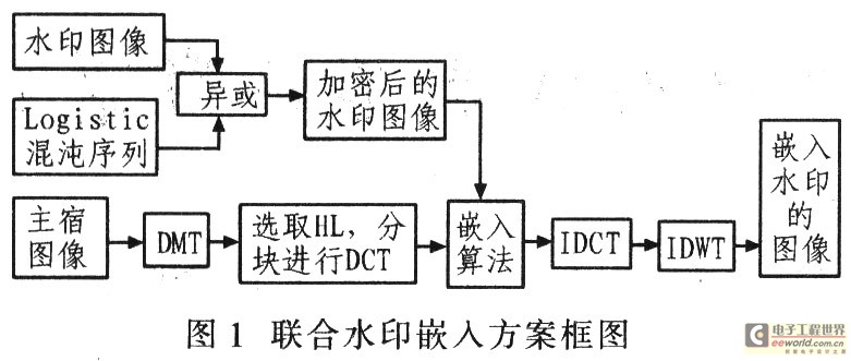 水印嵌入算法的主要思想:为了提高水印的安全性,在水印嵌入前先进行混沌加密,然后将宿主图像经过DWT得到4个子带:LL、LH、HL、HH,选择HL作为嵌入子带。为了使嵌入的水印可以均匀分布在HL子带,对HL子带分块进行DCT变换。将水印嵌入DCT变换后的中频系数。这里采用经典的比较中频系数法进行水印嵌入,嵌入过程如图1所示。