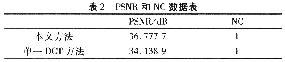 表2给出该法和单一DCT法的PSNT和NC值,从中看出在未受到攻击的情况下,两种算法的NC均为1。但本方法的峰值信噪比更高,达到36.777 7 dB,因此图像的质量更好。