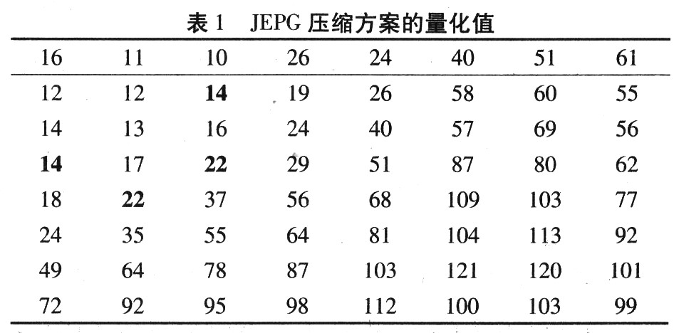 (5)对于DCT变换后的第i块系数,采用比较DCT中频系数法进行水印的嵌入。比较中频系数法的思想是:从中频区域选择两个位置鼠Bi(v1,v1)和Bi(v2,v2)进行比较,下标i表示第i块。可嵌入22个中频系数,如图3所示。图中FL表示块的低频部分,FH代表高频部分。FM是可选择嵌入的中频区域,因为嵌入FM区域可避免图像质量下降,而且能够提供较好的抗攻击能力。为获得较好的抗压缩攻击性能,选择系数时可参考表1的JPEG量化表。选择的两个DCT系数应满足调整它们的大小不会导致载体图像严重降质。因此要选择JPEG压缩算法中亮度量化值一样的系数。从表1能观察到系数(4,1)和(3,2)或(1,2)和(3,0)量化值相等,较适合用来比较。