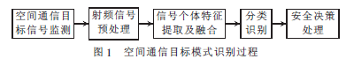 空间通信目标识别实质上是模式识别问题,其一般流程如图1所示。空间通信目标信号监测是指通过高保真接收机对射频信号进行检测、采样和量化,把监测到的空间信号转化成可分析处理的数字信号;射频信号预处理的目的是滤除噪声,对原始数字信号进行处理得到适合分析的目标数字信号;信号个体特征提取是在多种不同的变换域(时域、频域、高阶谱域等)对数字信号进行变换,提取能够反映目标个体本质的特征,并将所得的多维信号特征进行融合,得到适合分类的空间目标个体特征;分类识别过程是通过现代机器学习算法等在特征空间中把被识别目标划归为某一类特定的个体;在得到对未知空间通信目标的识别结果后,由安全决策处理模块对该未知目标进行安全分析,并作出相应的应对机制。