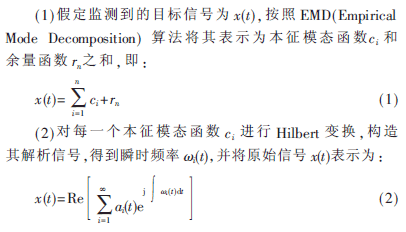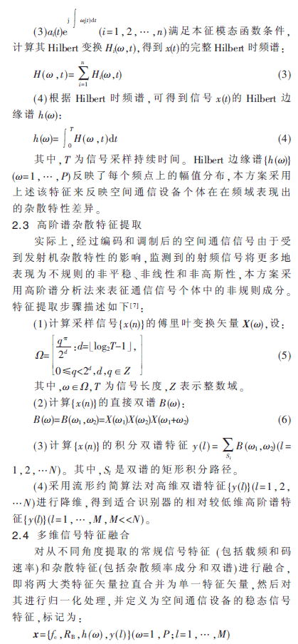 空间通信设备的一部分非线性噪声会以各种不同的调制方式附加在射频信号上,使得接收信号在频域产生微小变化,从而产生大量的杂散频率分量。为捕获不同发射机个体的这种差异,本方案应用HHT(Hilbert Huang Transform)时频法发掘信号个体的杂散频率成分,其特征提取步骤描述如下: