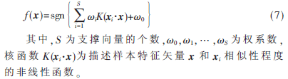 作为一种核函数类分类器,SVM通过核函数将输入矢量由低维特征空间映射到高维特征空间,将原始输入空间的非线性可分问题转化为高维空间的线性可分问题,其判决函数的一般形式为: