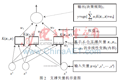 SVM分类函数形式上类似于神经网络,输出是S中间节点的线性组合,每个中间节点对应一个支持向量,如图2所示。SVM分类器解决了一般神经网络方法中无法避免的局部极值问题,而且专门针对有限样本情况设计,因而具有很好的使用价值。