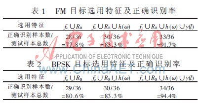 本方案主要对外场采集的高速运动通信设备(FM/BPSK)进行试验分析。实验选择载频(fc)、码速率(RB)、杂散频率(h(ω))、高阶谱(y(l))等四类特征参数来对不同的空间通信目标进行个体识别。实验中,用于分析空间信号个体特征分类性能的数据来自6部不同高速车载通信设备,其中FM和BPSK调制制式的数据样本各60组。每一类个体随机挑选4个样本用于训练分类器,其余样本用作分类测试。数据分析结果如表1和表2所示。