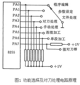 系统功能选择的方法有几种不同的方式,使用CRT显示器作为显示终端时,可以制作功能菜单,用户可以通过菜单选择功能。但经济型数控系统为了降低成本,一般不用CRT显示器,而用数码管组成显示终端。这时可用波段开关通过并行接口组成功能选择电路。图1是由接口电路8255和波段开关组成功能选择电路的原理图。