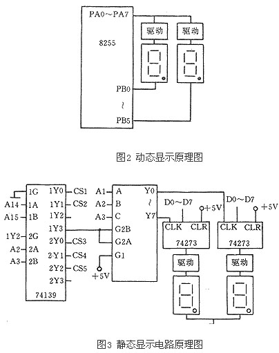 静态显示使用的元器件多,电路复杂,每个数码管有一个段显示地址,无位显地址。每个数码管上有一个锁存器将要显示的数据锁存,这种显示方法只要不向数码管送新的数据,其显示内容不会消失。如果显示数据不变,不需要显示刷新,只有在要显示的数据发生变化时,才需要向显示器注入要显示的数据。由于系统中有EPROM(用来存放系统程序),RAM(用来存放加工程序),接口电路8255(用来作输入、输出)等,每片内存都要有一定的地址范围,而数码管地址可以连续。为解决这个问题可以采用二级译码,电路原理如图3所示。图中CS1作为系统的EPROM片选信号,CS2作为系统的RAM片选信号,CS3、CS4及CS5作为系统的8255片选信号。3—8译码器用来处理显示,若系统中有多排数码管时,可以使用多个3—8译码器,不同的3—8译码器A、B、C端接不同的地址线。