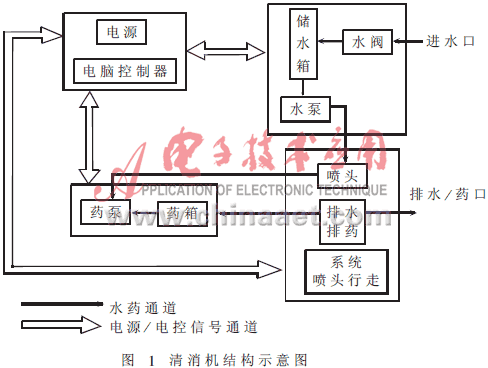 内窥镜清消机由立柱和机柜组成。清消机结构示意图如图1所示。立柱上装有能够上下运动的喷碗、高压水碗、防溅水罩;机柜上有控制面板,机柜内部装有水箱、药箱、水泵、药泵及升降电机等,在排水/药处还有水、药分离装置,通过控制水/药分离电机达到切换排水、排药阀门的目的。