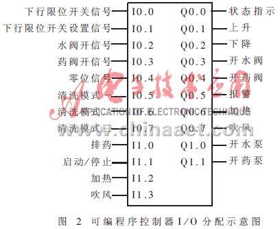S7-214的输出分为三组,可以分别接不同的工作电源,以适应不同负载的要求。其中Q0.0~Q0.6的工作电源为DC24V,分别接指示灯、报警器以及控制上升、下降、水阀、药阀和加热的继电器;Q0.7~Q1.1的工作电源为AC220V,分别接吹风机、水泵和药泵。